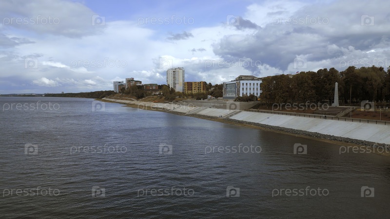 Вид сверху речной набережной города с лесом. Клип. Ландшафтная набережная городского берега реки. Красивый пейзаж речной набережной с городским парком