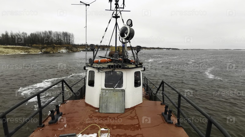 Вид с промышленной лодки, за которой плывет баржа.Клип Концепция водного транспорта грузов