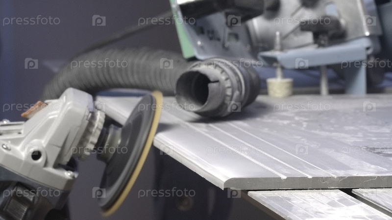 Рабочий полирующий доски с диском. Креативный. Близкий план машины с диском для полировки поверхностей. Плотник полирует доску или плитку