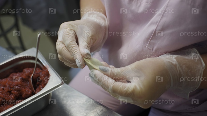 Клип. Близкий снимок рабочего, делающего пельмени, кладящего мясо в тесто