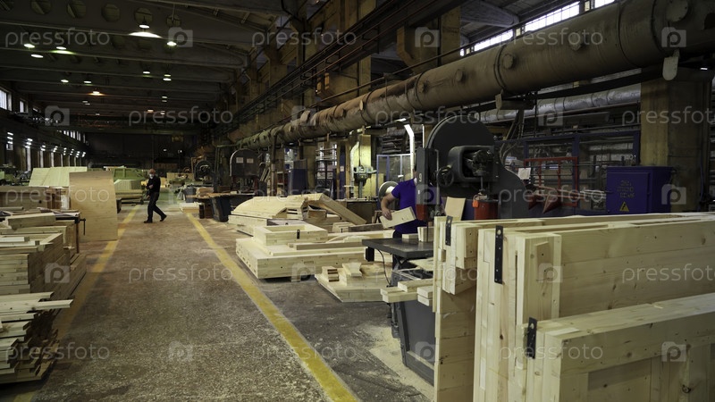 Деревообрабатывающая фабрика со сложной техникой, организованными рабочими станциями и обильным количеством древесных материалов
