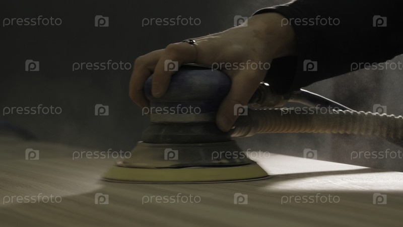 Близкий план мастера полировки деревянной доски.Креативность.Полировальная машина в руках мастера по обработке древесины.Мужчина полирует деревянный стол с помощью машины в мастерской