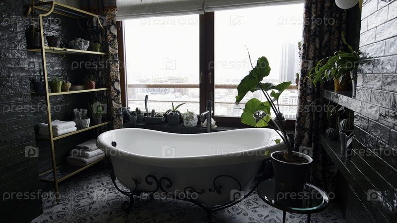 Современная современная темная ванная комната с естественным светом и множеством зеленых растений. креативное. уютные детали квартиры