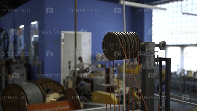 Ротационная промышленная машина с катушками и проводами.Креативность.Мастерская на промышленном заводе со прядящимися машинами