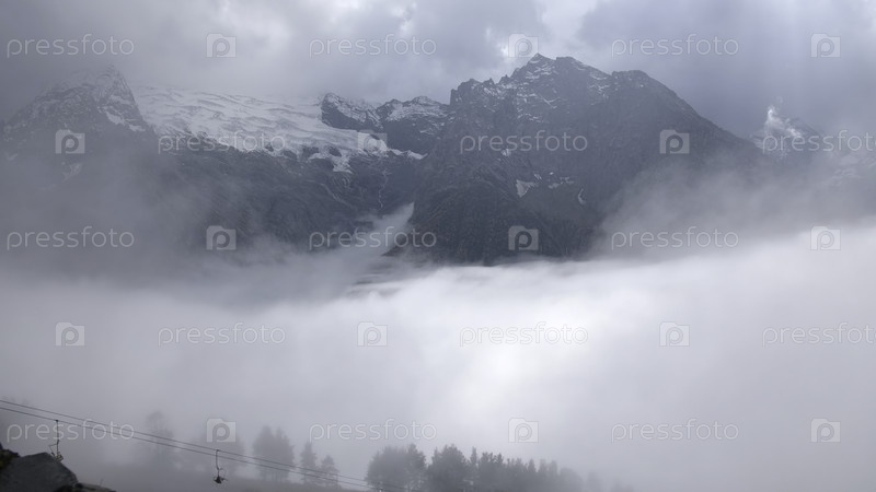 Горный пейзаж с подъемами в облаках и заснеженными вершинами. творческий. мистический ландшафт со сказочными горными вершинами и низкими облаками. пасмурные облака на высоте снежных пиков