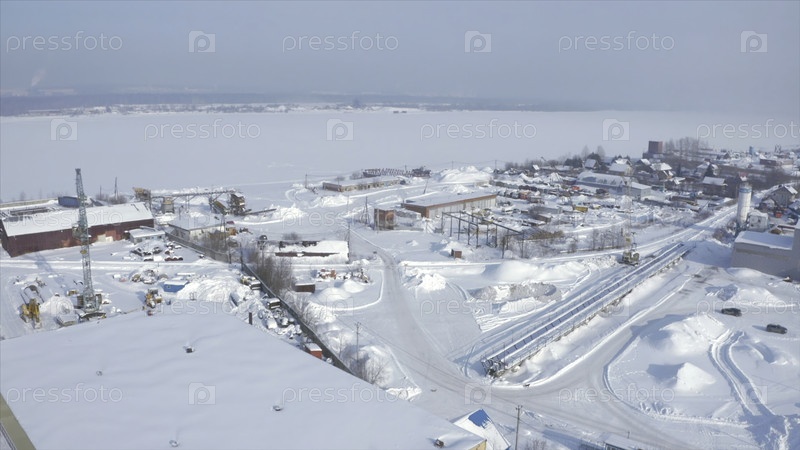 Индустриальный город на берегу реки зимой. Клип. Вид сверху города с морской промышленностью возле берега реки. Морский индустриальный город у реки в солнечный зимний день