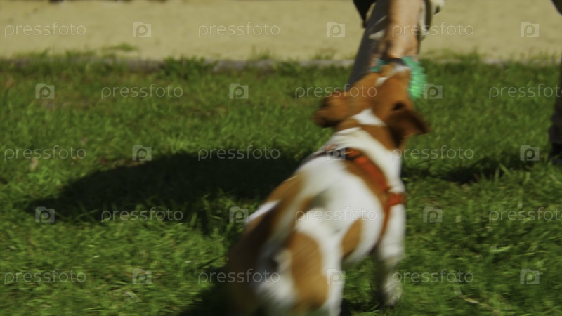 Мужчина играет в мяч с собакой в летний день. Скриншоты. Человек веселится, играя в мяч со своей собакой в парке. Мужчина играет со своей собакой на зеленой траве в парке летом