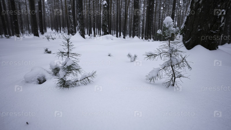 Вращающаяся камера в зимнем лесу. СМИ. Оглянись вокруг себя в диком лесу среди высоких деревьев и снежных заносов зимой. Маленькие елки в зимнем диком лесе
