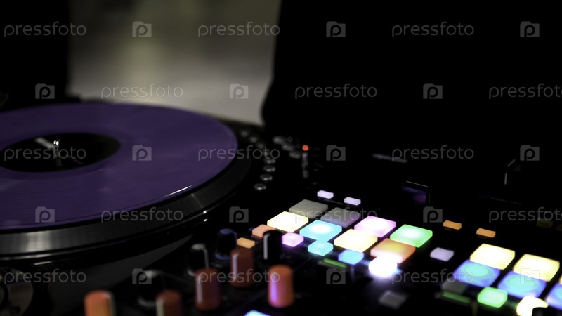 Берлин, Германия, 6 декабря 2022 года: Ближайшее изображение диджейской консоли, управляемой мужчиной с татуировками на пальцах и руках