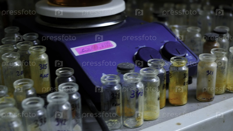 Химические пробирки в лаборатории.Скриншоты.Маленькие банки со словами химических элементов из стекла, стоящие рядом друг с другом.Высококачественная запись 4k