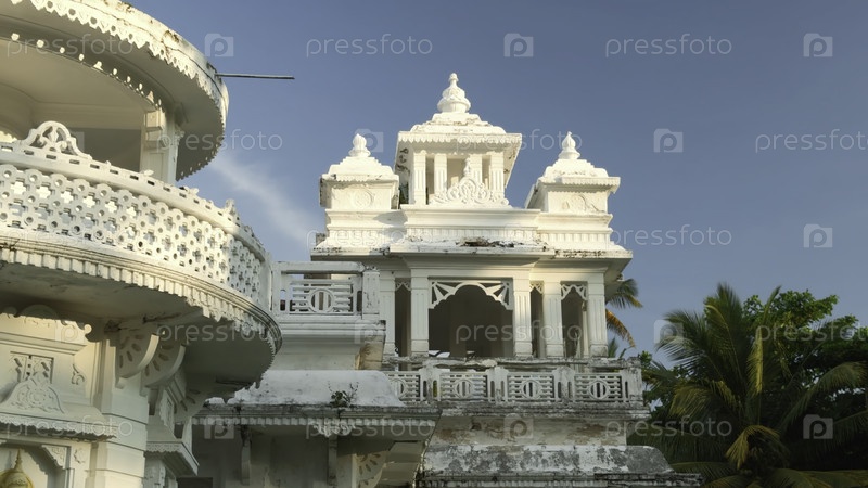 Белый индийский храм с пальмой. действие. красивый белый храм с буддийскими узорами. белый буддистский храм с пальмами в солнечный летний день