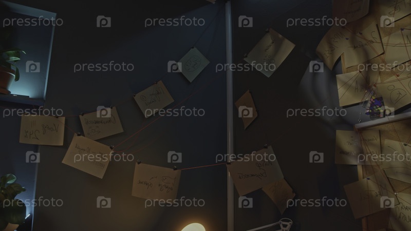 Опубликованные заметки и темы. Скриншоты. Интерьер детектива с записками и нитью. Записки висели на красной нити по всему офису