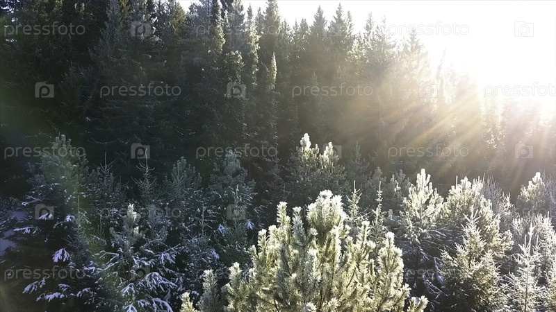 Красивые морозы на ельниках с ярким солнечным светом. Клип. Сказочный пейзаж со льдом и сильным солнцем. Зимний ландшафт леса и теплых лучей солнца