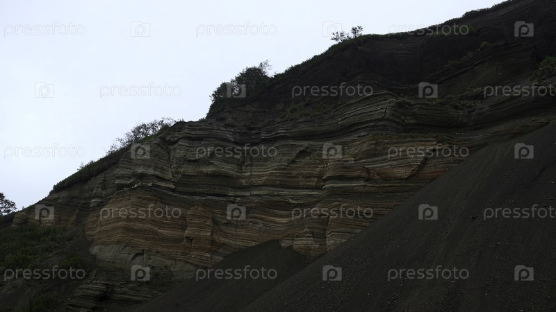 Стенка земного карьера. клип. естественная стена с линиями земных пород. стены земли после копания в пасмурный дождливый день