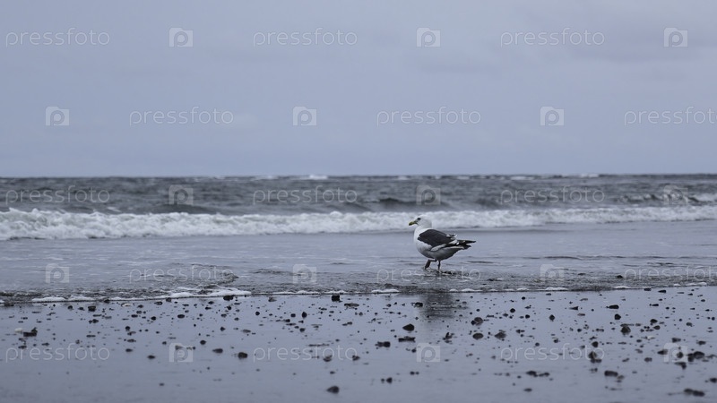 Одинокая чайка стоит на берегу моря в пасмурный день