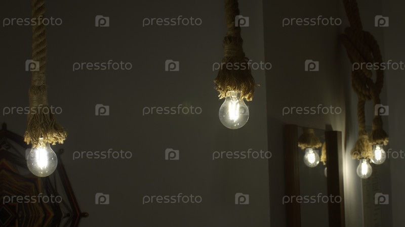 Горящие стильные лампочки, украшенные веревками. СМИ. Стильные висячие лампочки, этнический интерьер