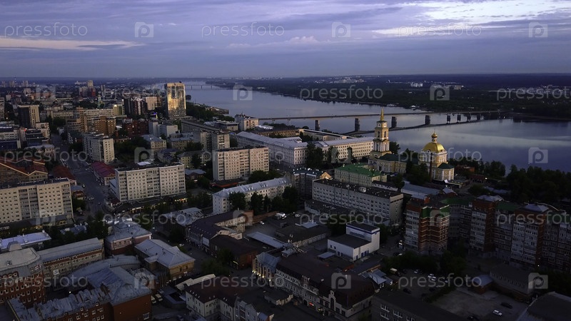 Вид с воздуха на заходящее солнце над широкой рекой Клип Зеленый город, расположенный вдоль реки