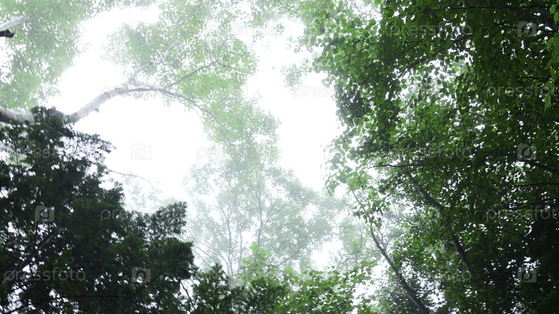 Вид снизу на кроны зеленых деревьев против неба. Клип. Плоская корона деревьев и кустарников против неба. Вид снизу на зеленые деревья густого леса с прохладным туманом
