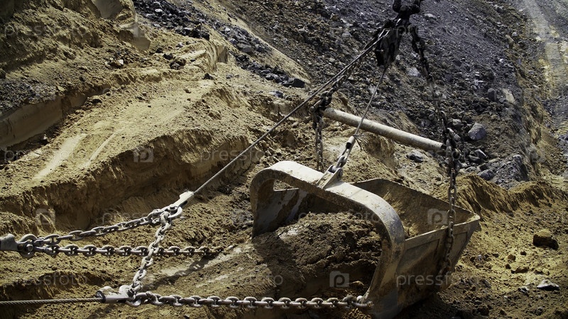 Близкий взгляд на копающее ведро, которое надежно прикреплено к цепям, полностью подготовленное для раскопок земли