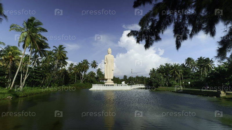 Цунами Хонганджи Вихара, Хиккадува, Шри-Ланка. Действие. Красивая белая статуя среди зеленых пальмовых деревьев и голубого облачного неба