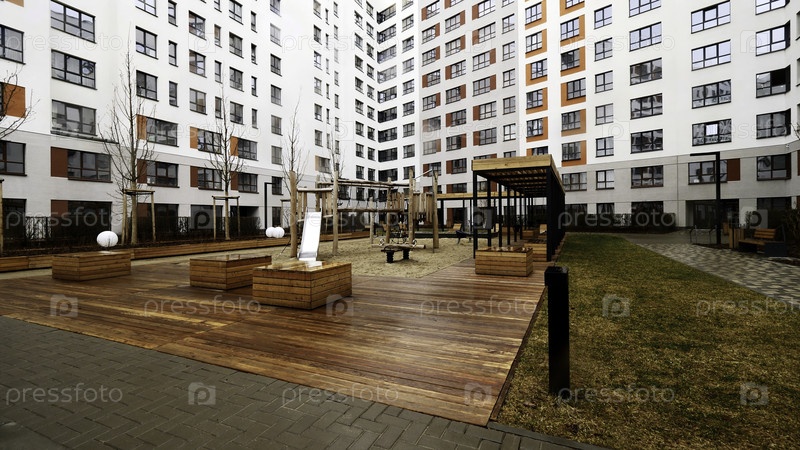 Красивый внутренний двор нового многоэтажного жилого здания. Фотоснимки. Уютная спальная зона с игровой площадкой