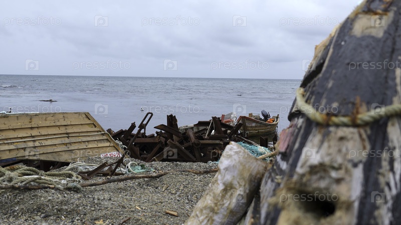 Руины рыбацких лодок и мусор на берегу моря. Клип. Мусор и руины морских лодок на берегу в пасмурный день. Обломки и разрушенные суда после шторма на побережье