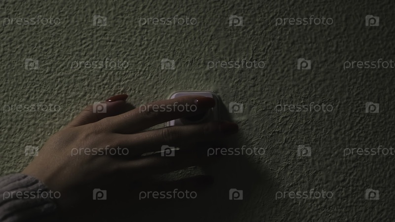 Концепция. Близкий план человека, нажимающего дверной звонок рукой. Звонок любовников на стене по двери. Гость нажимает дверный звонок