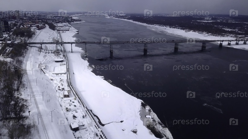 Зимняя река с дорогами и автомобилями поблизости в маленьком городке