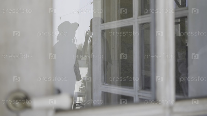 Отражение женщин, делающих макияж. Действие. Отражение в окне с женщинами, готовящимися к съемкам. Отражение в окне с женщиной-моделью перед съемкой
