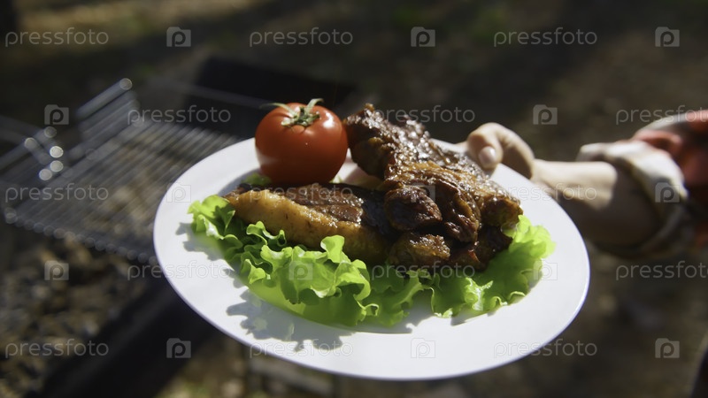 Клубовый снимок тарелки с мясом и овощами для барбекю. Фрагмент кадров. Яркая еда на тарелке с жареным мясом и овощами в солнечный летний день. Женщина держит тарелку с барбекью в природе летом
