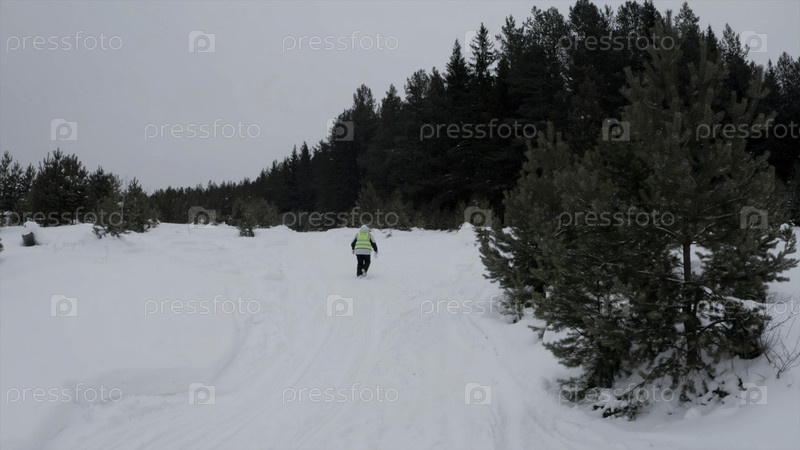 Вид с воздуха человека в отражающем жилете, идущего по заснеженной земле к зеленому лесу