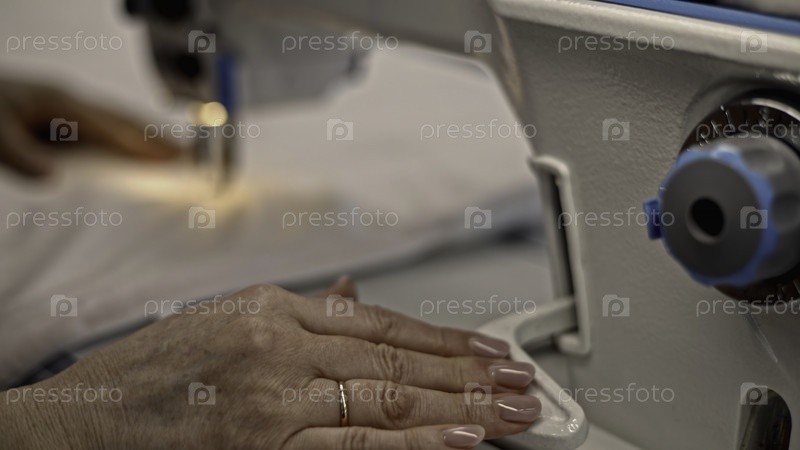 Близкий снимок швеи, шиющей белый подушечный чехол на фабрике СМИ Женские руки при работе по пошиву