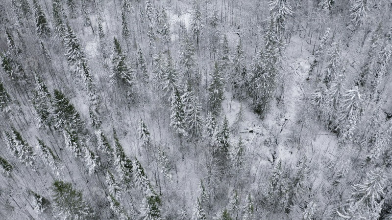 Вид сверху дикого хвойного леса зимой. Клип. Летающий над вершинами снежных деревьев зимой. Красивый зимний лес со снежными деревьями