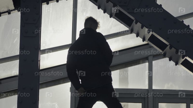 Парень танцует хип-хоп на мосту. Акция. Крутой танец в современном стиле уличного танцора. Молодой человек танцует в современном стиле у стальных балки здания