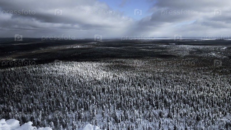 Полет над густым зимним сибирским лесом днем.Клип.Белая гора и замороженная метеорологическая башня на ее вершине