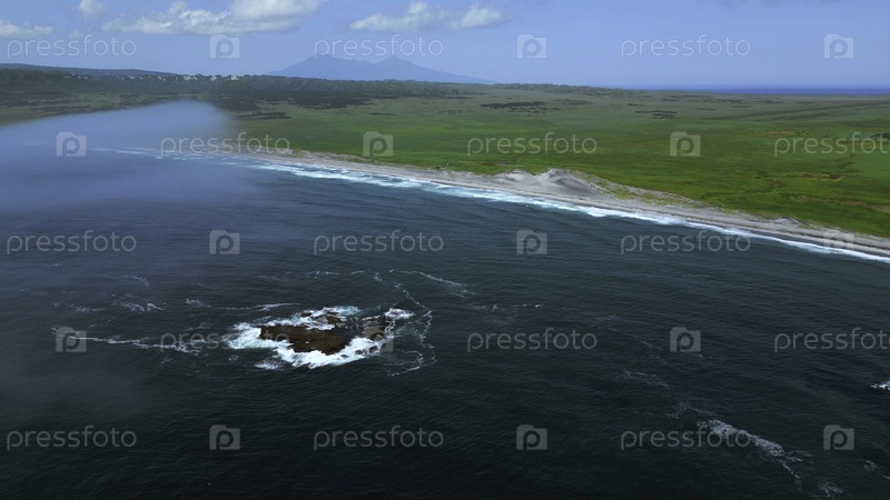 Вид сверху на каменные рифы у побережья и зеленое поле. Клип. Северный пейзаж зеленых лугов и бирюзовых морских волн