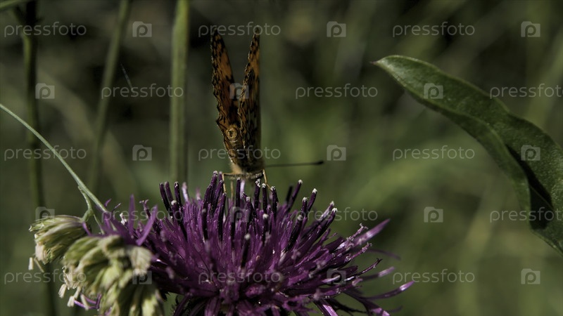 Близкий план опыляющей цветок бабочки.Креативность.Прекрасная бабочка сидит на цвете.Бабочка на диком цветке в летнем лугу