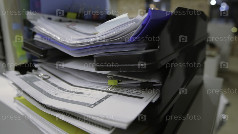 Ближайшее изображение стеков документов файлы в офисе. запись на камеру. бумаги деловых отчетов в пластиковой папке