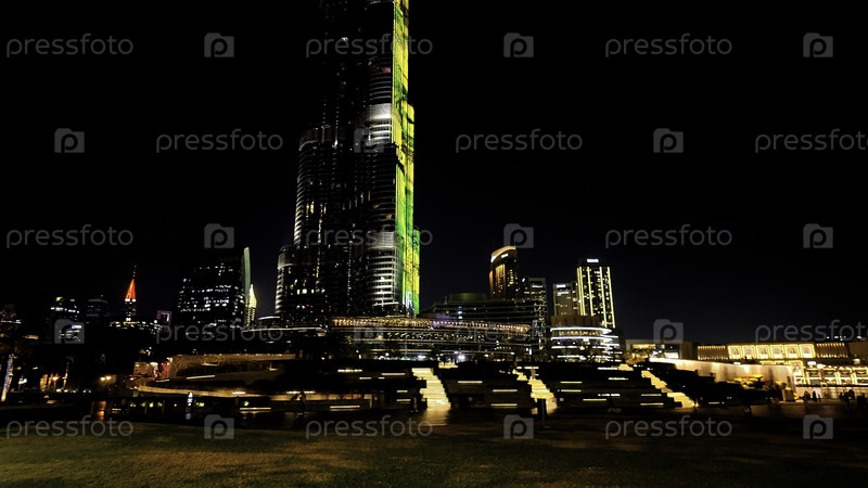 Дубай, Объединенные Арабские Эмираты - 12 декабря 2023 года: Бурдж Халифа самое высокое здание ночью. Действие. Освещенный небоскреб ночью