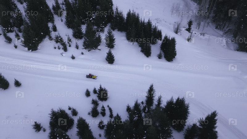 Вид сверху мотоцикла на снегу в лесу. Клип. Одинокий мотоцикл, едущий по зимнему шоссе в лесу. Снегоход проезжает через зимний лес