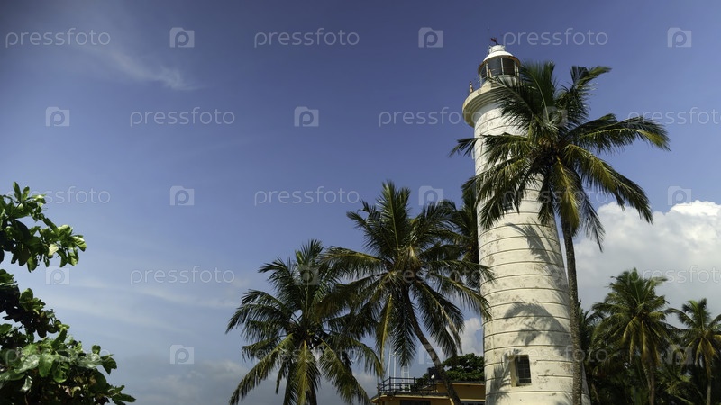 Красивый маяк с пальмами на берегу тропической бухты. Действие. Прекрасный берег залива со маяком и пальмами. Маяк с пальмами на тропическом пляже в солнечный летний день