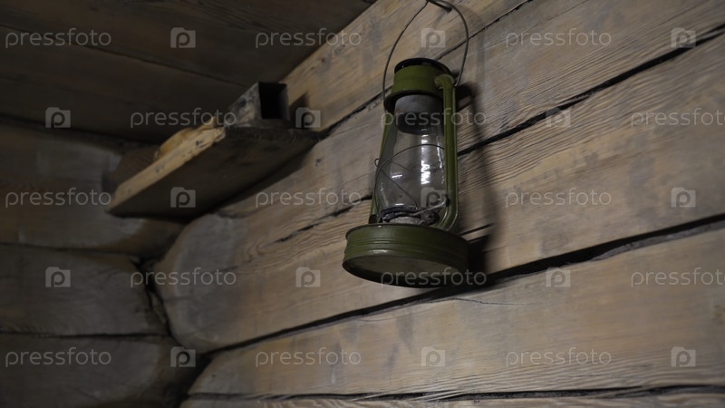 Древняя деревянная комната с винтажными предметами. СМИ. Внутри старого деревянного дома со старыми предметами. Античный фонарь, висит на деревянной стене дома