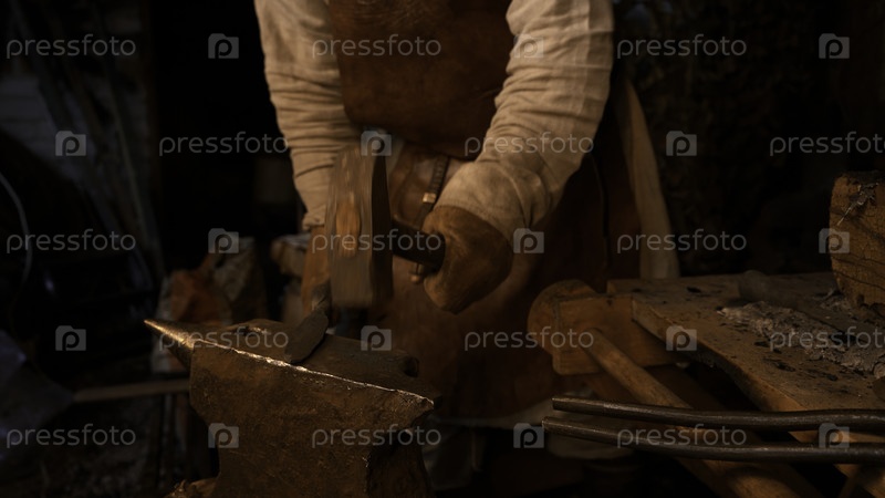 Специально подготовленный человек в древней русской одежде работает с железом и высокой температурой