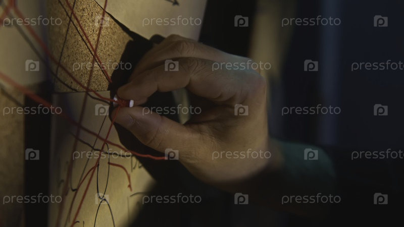 Клубовый снимок доски с записями и нитями. Фрагмент записи. Мужчина расследует и фиксирует доказательства на борту. Мужчина проверяет фотографии и заметки на исследовательской доске