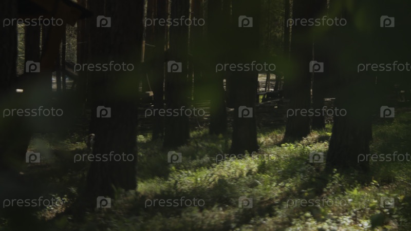 Мужчина гуляет с собакой в парке в летний день. Скриншоты. Человек прогуливает собаку на поводке в лесу в солнечный летний день. Мужчина гуляет с терьером Джека Рассела в рекреационном центре в лесах