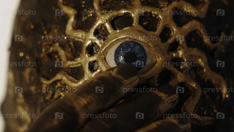 Ближайший снимок страшной золотой маски с широко открытым голубым глазом.Креативно.Мужчина прикасается к лицу золотым пальцем, металлические элементы, концепция грима и косплея