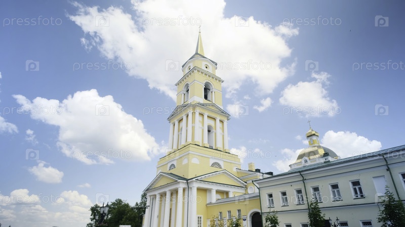 Низкий угол изображения желтого здания собора на фоне голубого облачного летнего неба