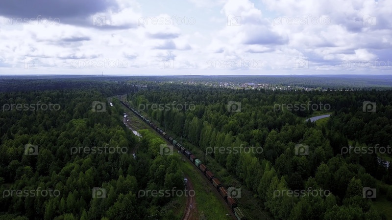 Вид с воздуха длинного движущегося грузового поезда вдоль зеленых лесных деревьев