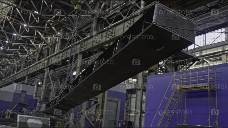 Металлическая конструкция переносится по кабелям на фабрике. Сток-клип. Подъемные кабели перемещают металл вокруг помещений завода. Передача металлических структур на машиностроительном заводе