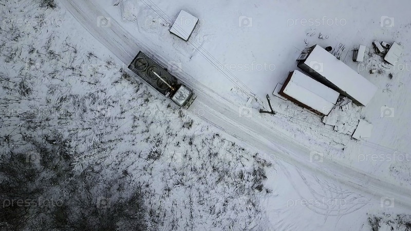 Вид с воздуха сельской дороги, покрытой снегом. Клип. Летающий над сельской дорогой и деревней